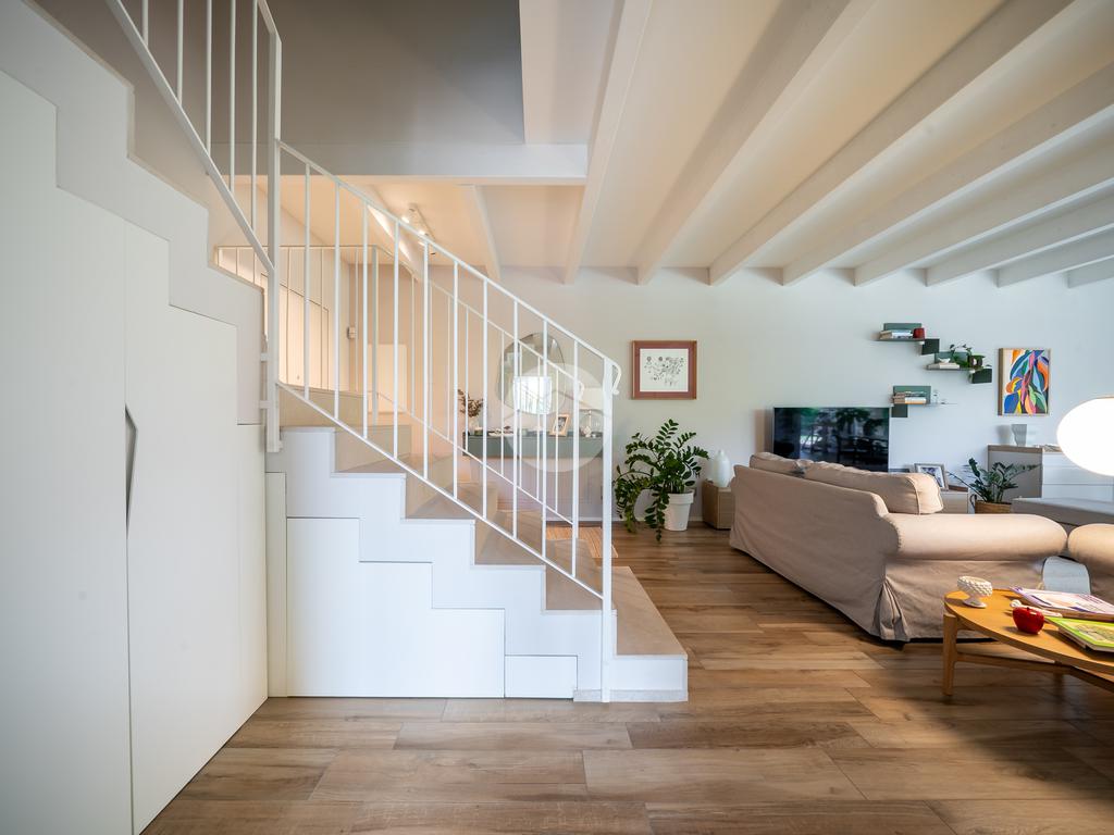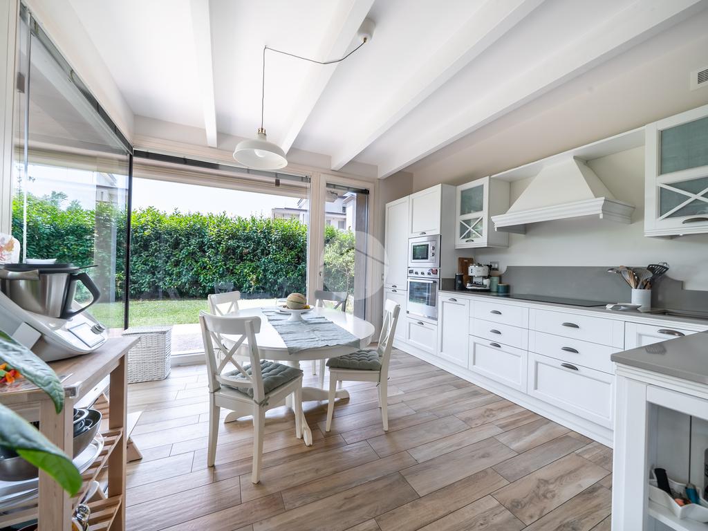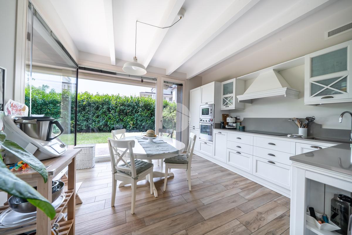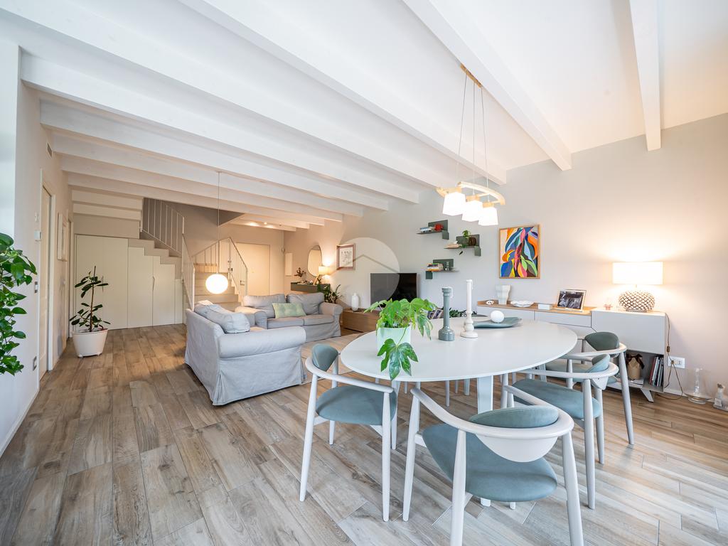 Gli spazi interni sono stati progettati con grande cura ai dettagli: al piano terra troviamo una luminosa zona giorno con cucina abitabile, caratterizzata da finiture eleganti in gres effetto legno, che conferiscono calore e modernità all'ambiente.