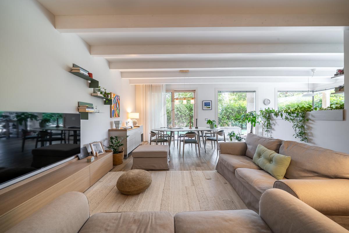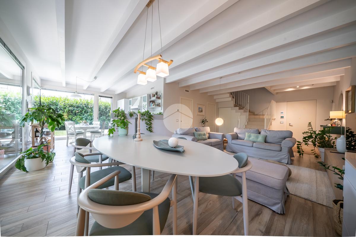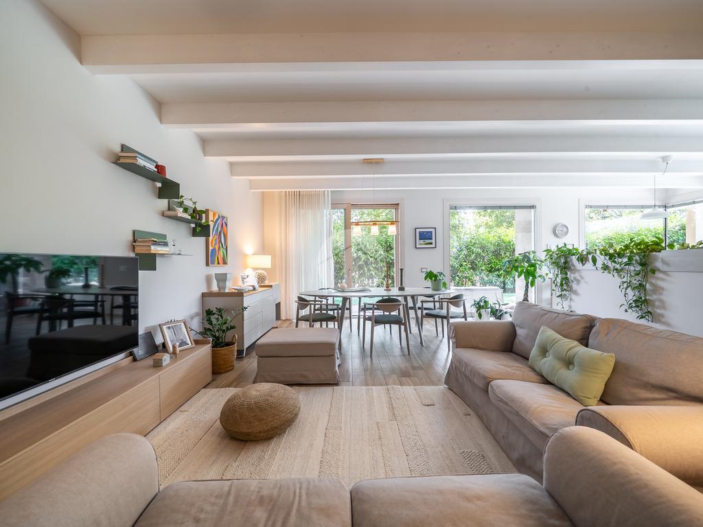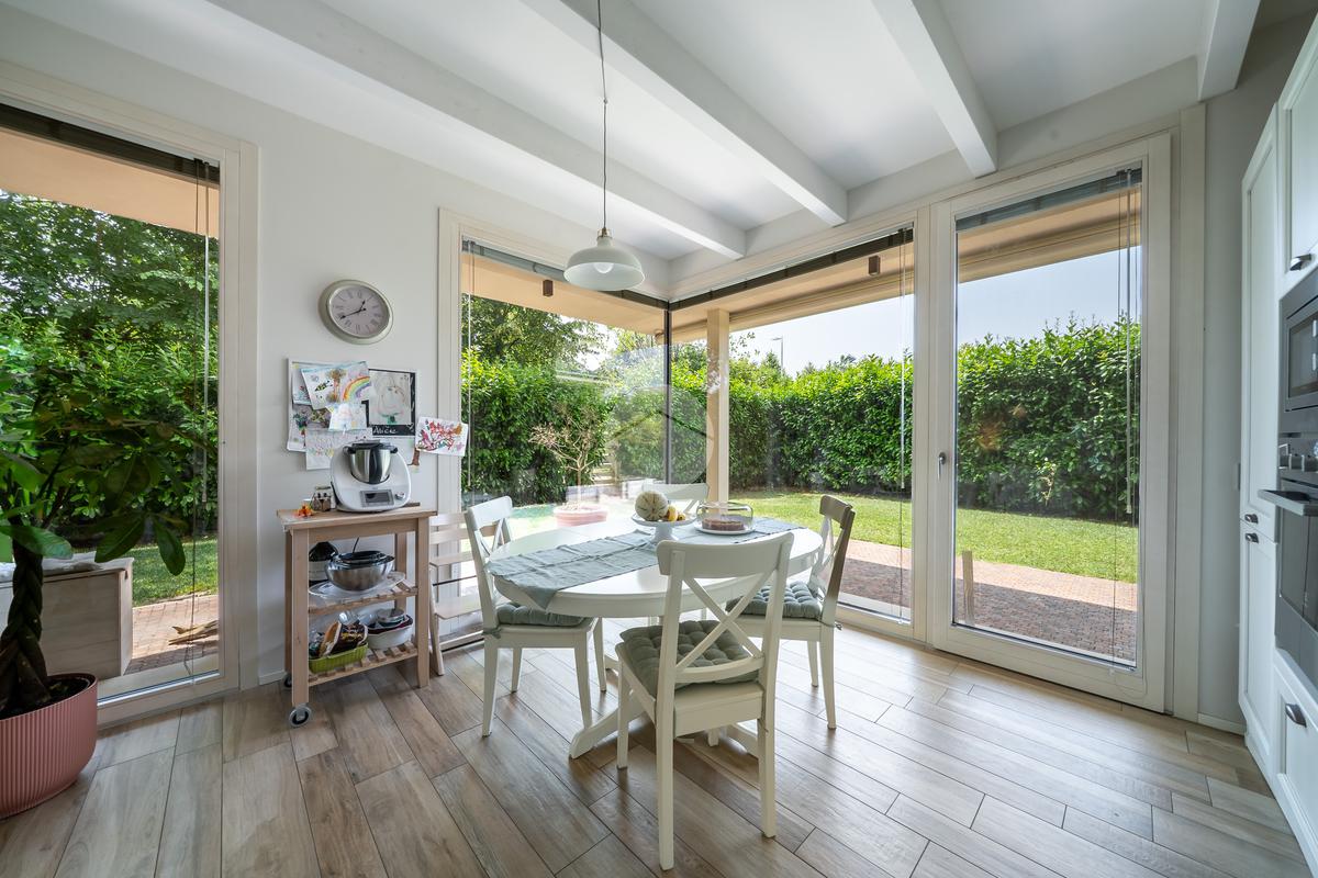 Gli spazi interni sono stati progettati con grande cura ai dettagli: al piano terra troviamo una luminosa zona giorno con cucina abitabile, caratterizzata da finiture eleganti in gres effetto legno, che conferiscono calore e modernità all'ambiente.